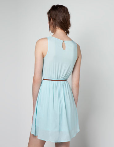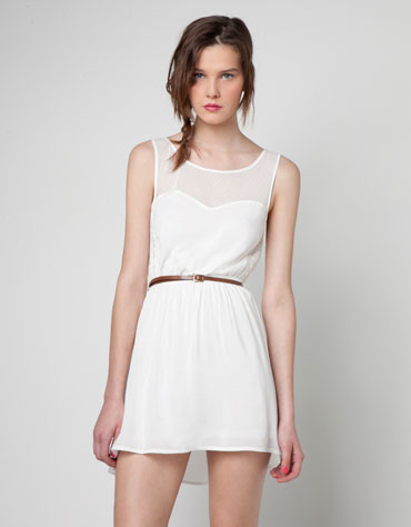 É mais curto a frente, de lado tem uns pormenores em renda, um decote em coração e com um tecido por cima do decote muito fino (que não sei o nome) e um cinto castanho.